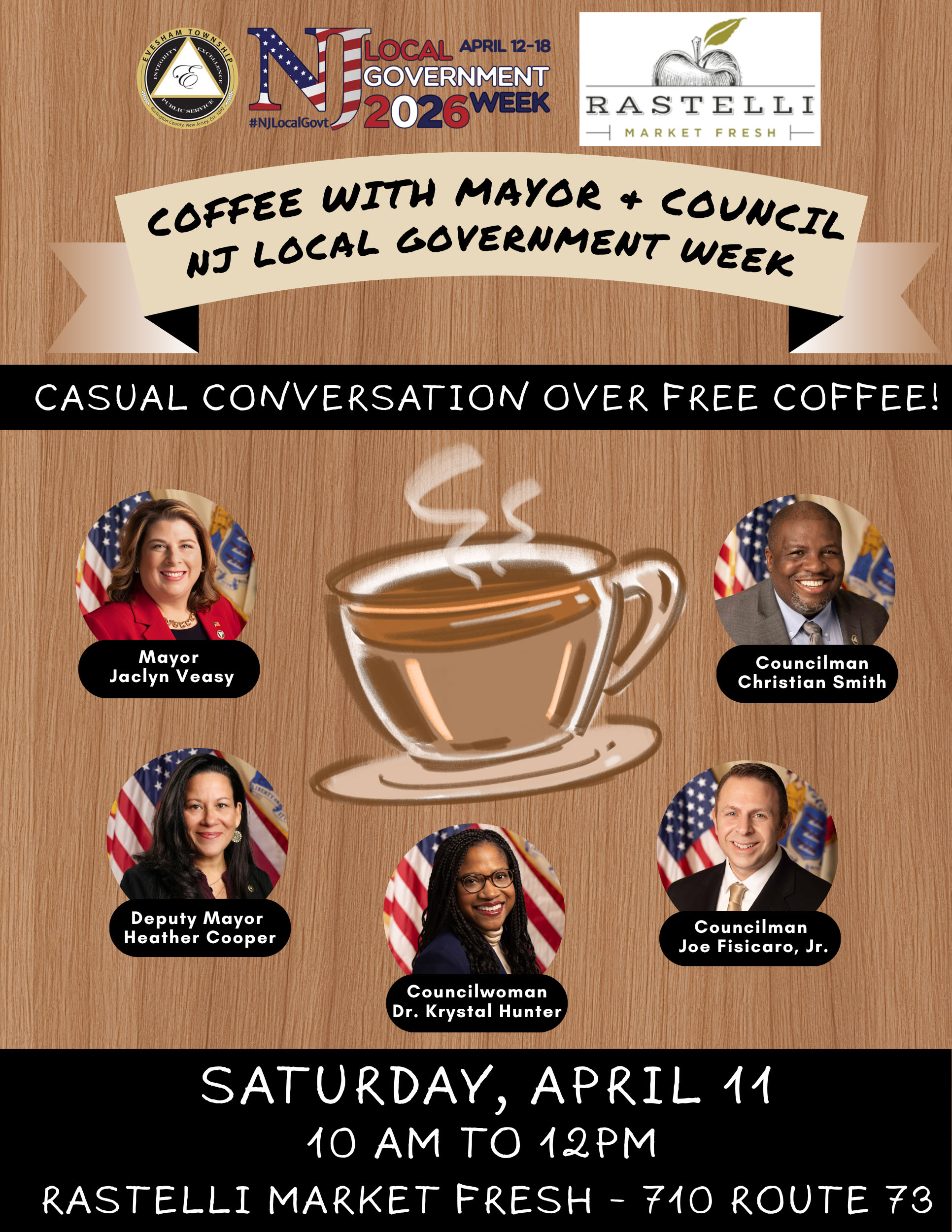First up is Coffee with Mayor and Council on Saturday, April 11, from 10 a.m. to 12 p.m. at Rastelli Market Fresh located at 710 Route 73. Enjoy friendly conversation over a nice cup of coffee.