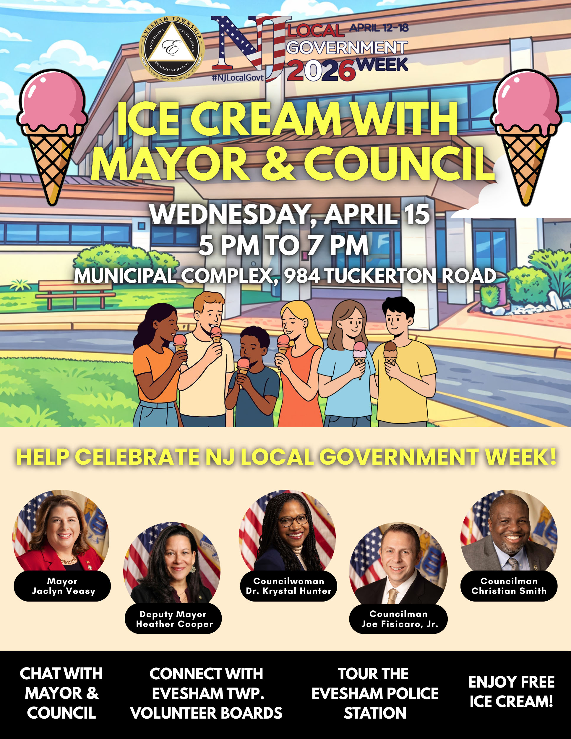 Or, if you prefer a sweet treat, join us for Ice Cream with Mayor and Council on Wednesday, April 15, from 5 p.m. to 7 p.m. at the Evesham Municipal Complex at 984 Tuckerton Road. In addition to the free ice cream, you can tour the Evesham Police Station and learn about the work of our township volunteer boards.